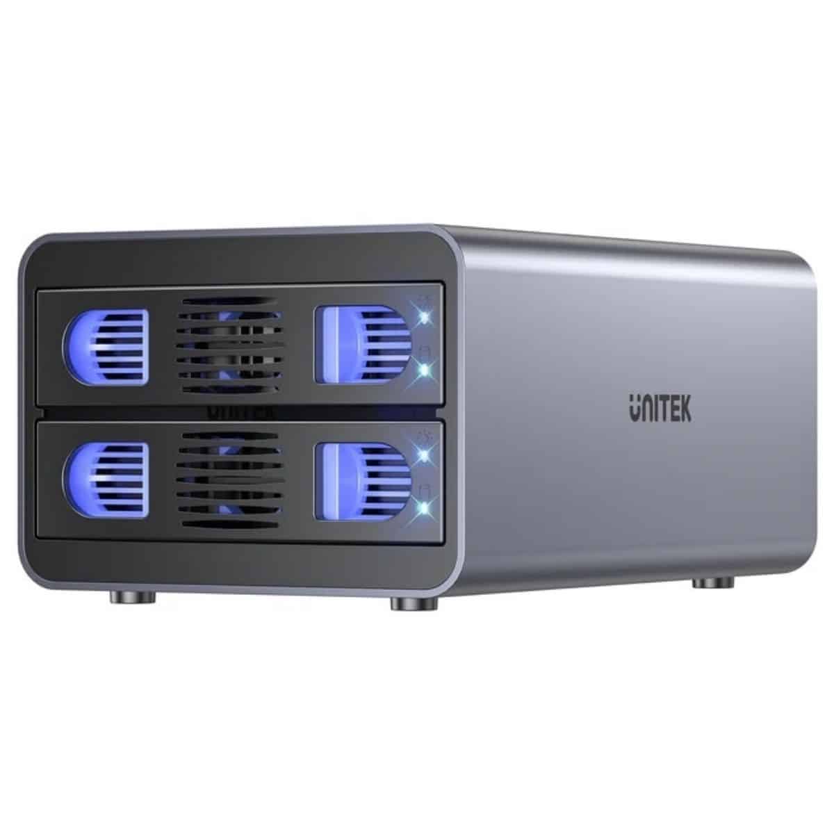 Soporta discos de 2.5″ y 3.5″ SATA tanto HDD como SSD. Hasta 40TB en total.