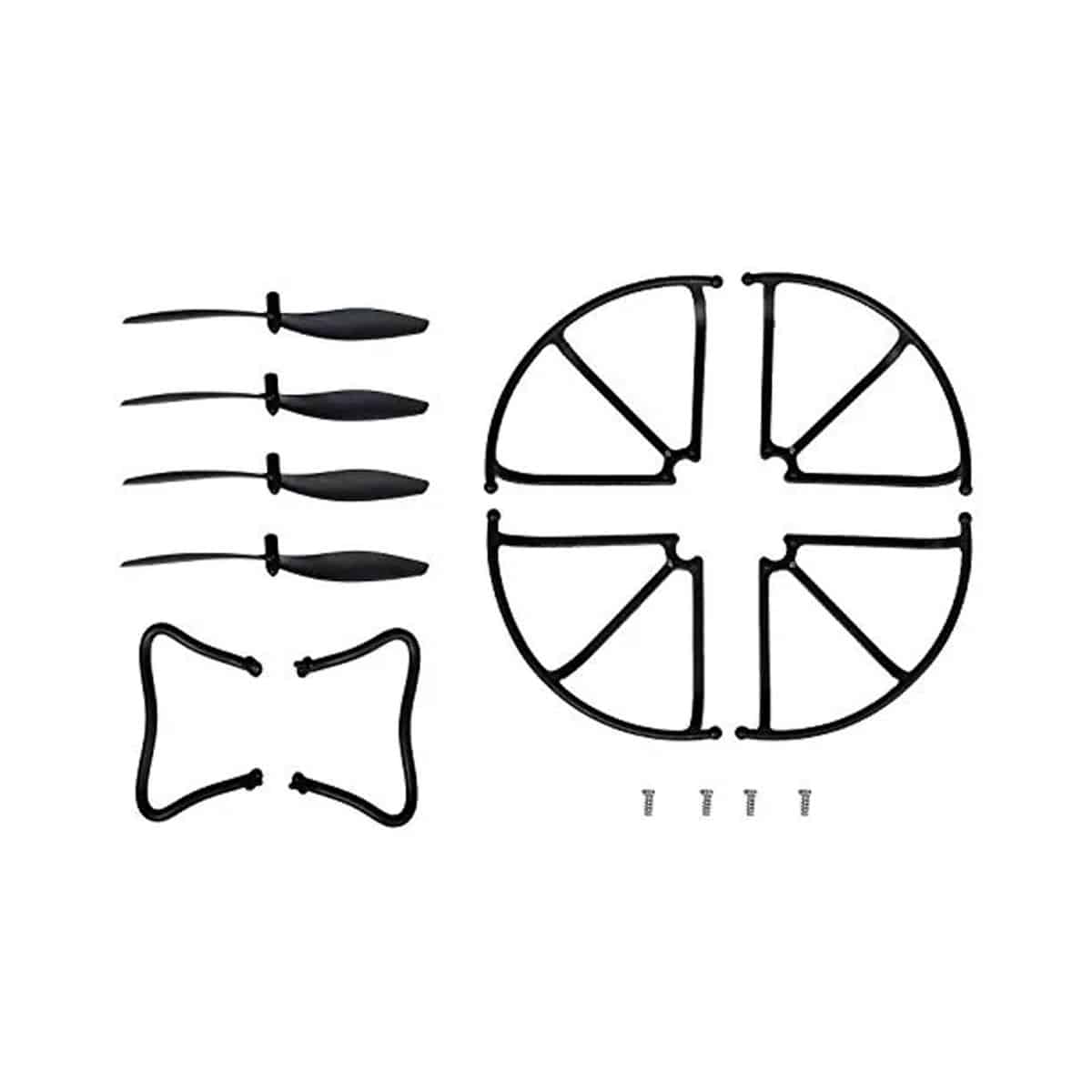INCLUYE: 4 HÉLICES, 4 PROTECTORES DE HÉLICES, 2 TRENES DE ATERRIZAJE, 4 TORNILLOS DE HÉLICES.