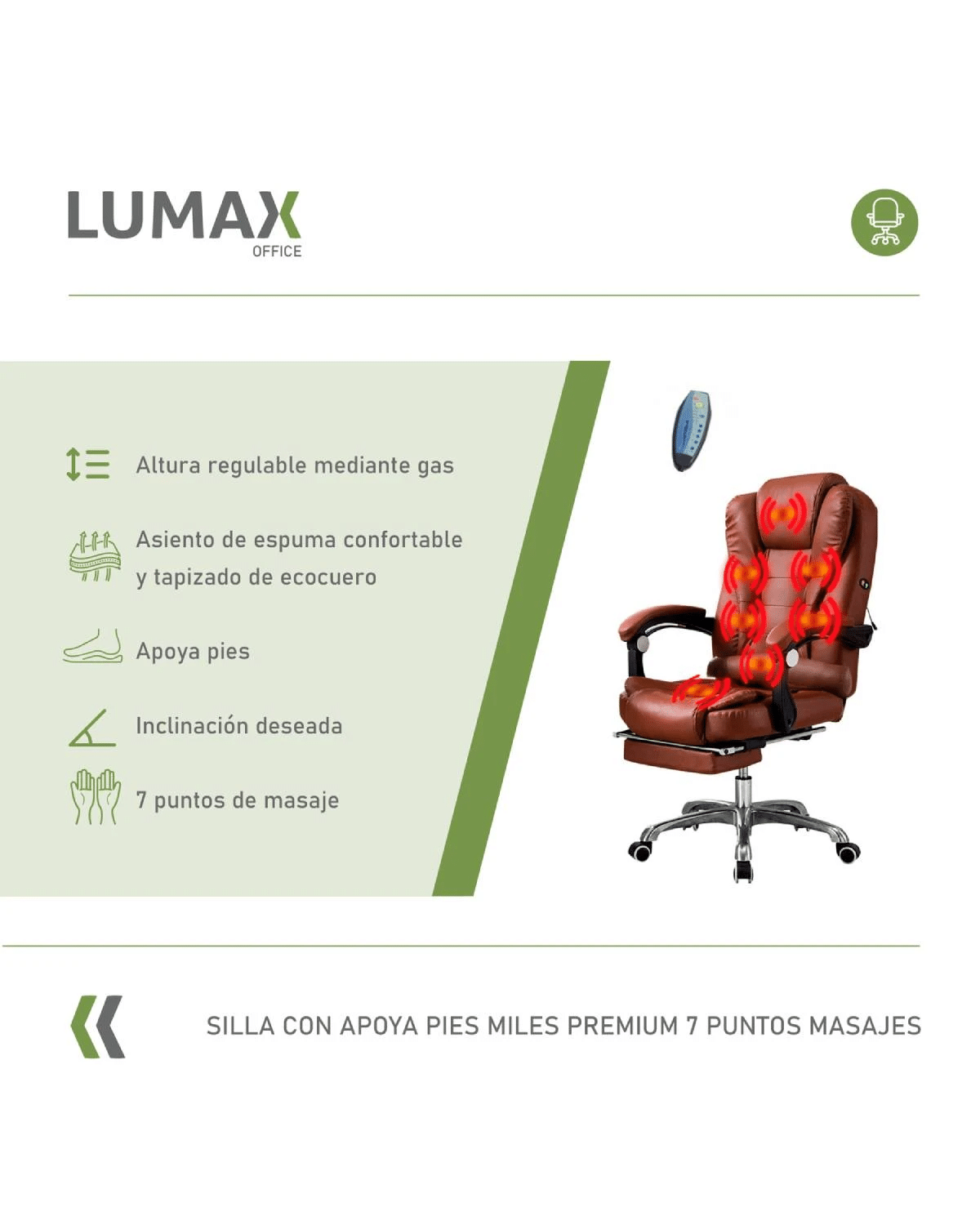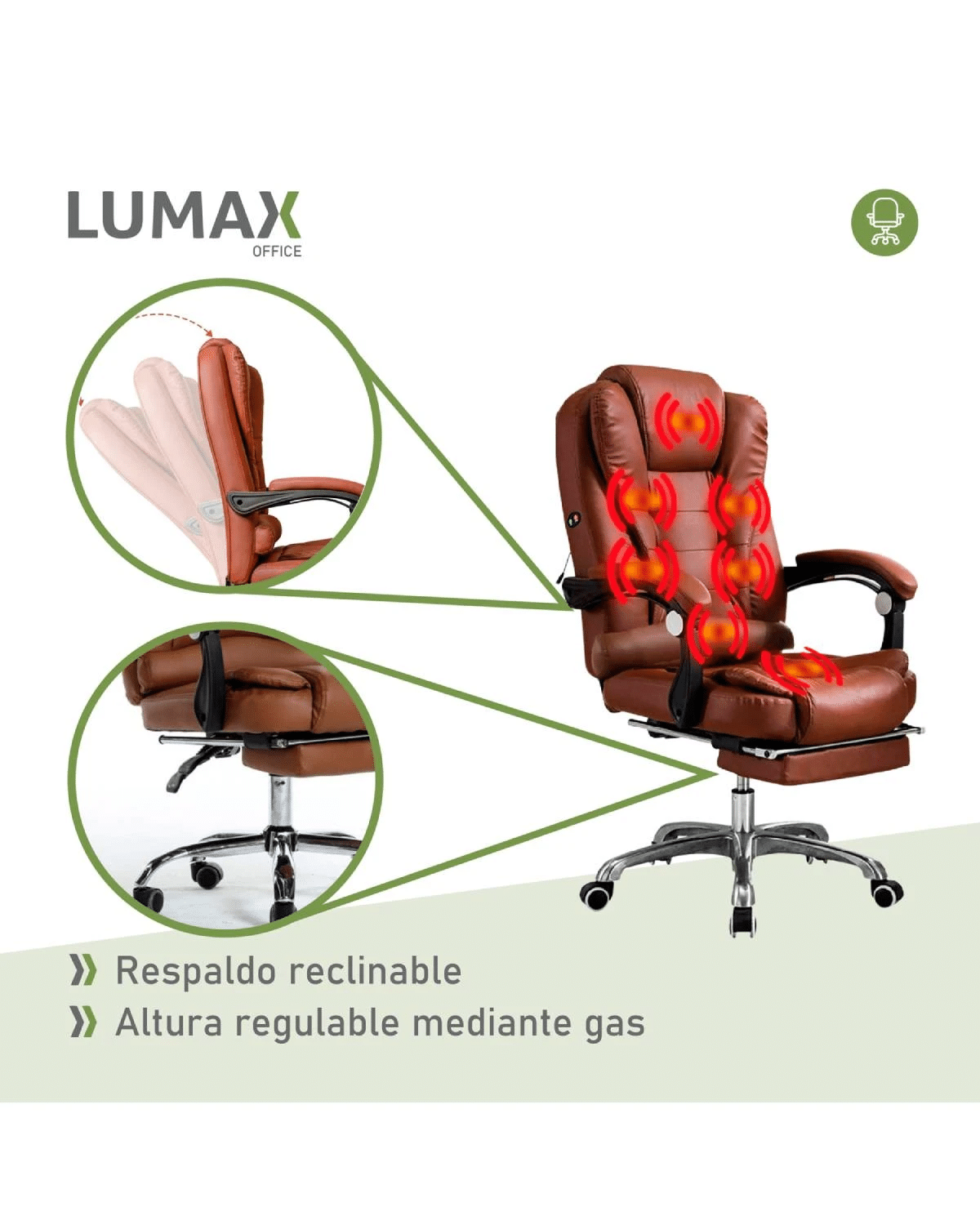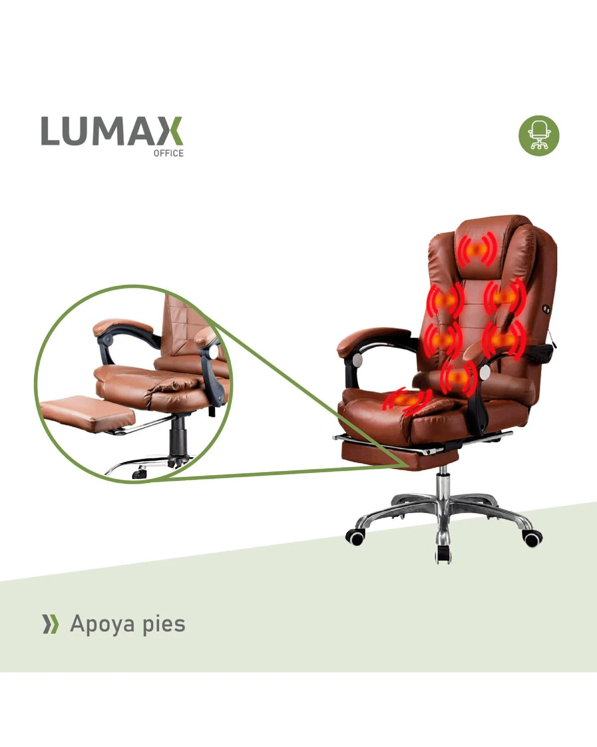 Silla Ejecutiva en cuero Lumax Modelo Miles con Apoyapies y 7 Puntos de Masaje – Marron