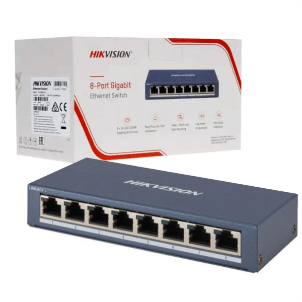 Switch Hikvision de 8 puertos Gigabit. Equipado con 8 puertos Gigabit Ethernet, este switch proporciona conexiones de red rápidas y estables. Ideal para entornos con múltiples dispositivos conectados, garantiza una transferencia de datos eficiente y de alta velocidad. Perfecto para oficinas, empresas y hogares, asegurando un rendimiento de red óptimo y una gestión eficaz del tráfico.